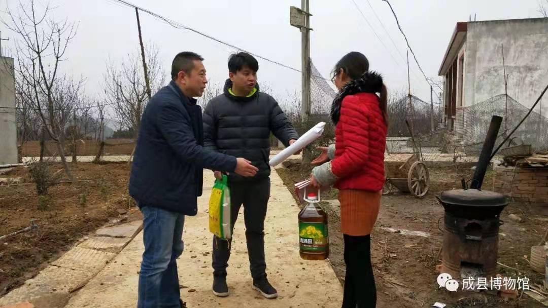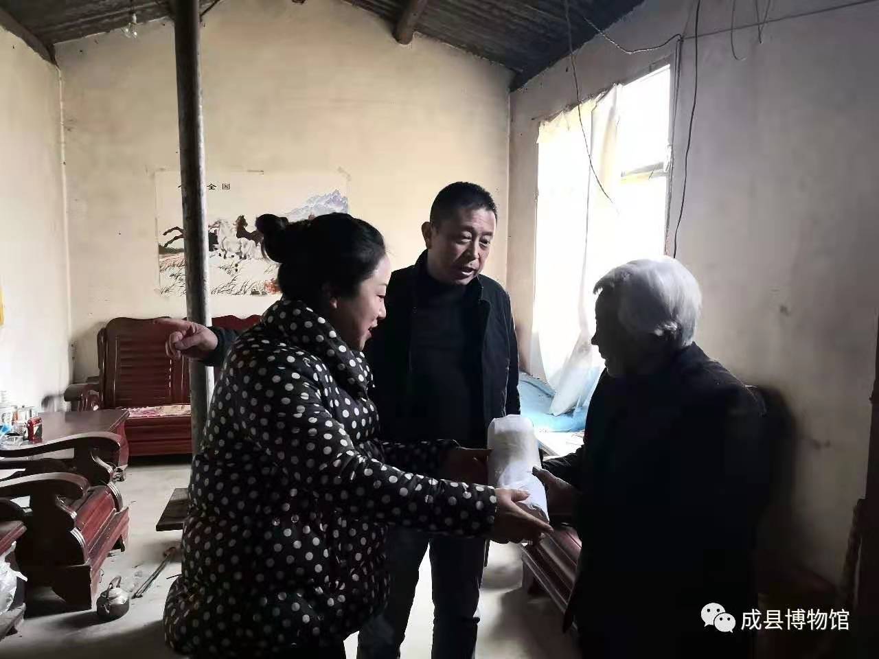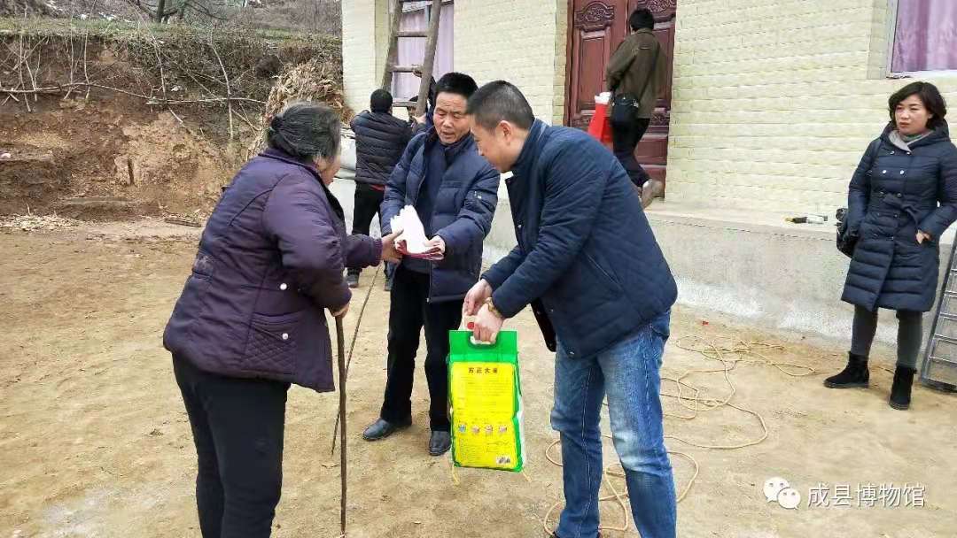 2019年1月30日,在传统佳节春节前夕,成县博物馆在馆长刘恒,副馆长南宁同志的带领下,前往帮扶地抛沙镇东营村,对帮扶贫困户进行节前走访慰问。为8户帮扶贫困户家里送去了大米、清油、中堂、春联等慰问品。并为其中家庭情况比较特殊的冯淑英家新建的房屋定制了防盗网,专门请技工人员上门安装。
