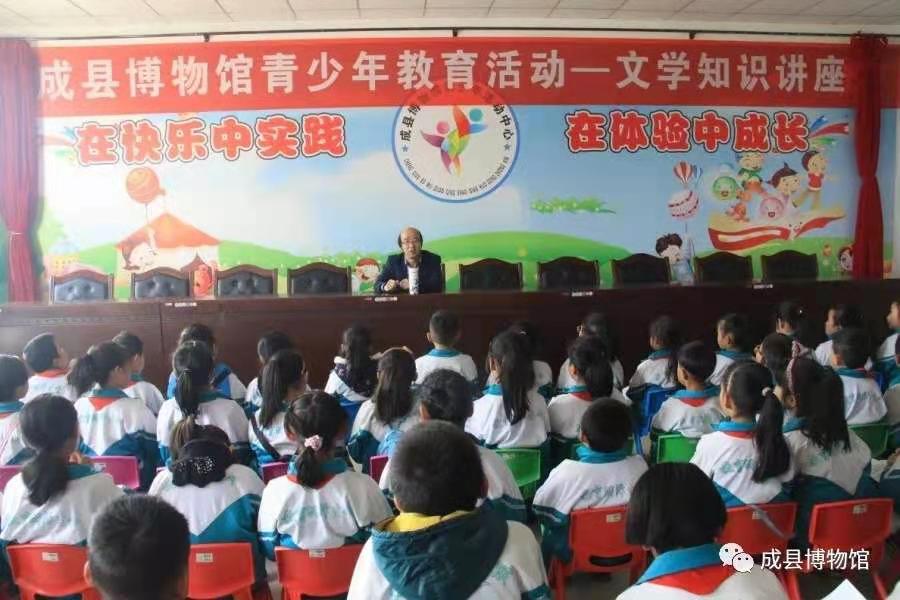 由我们专业的讲解人员给同学们做了专业、详细的讲解。通过对我们全部展厅陈列和展板内容的讲解,让同学们了解到成县在历史的长河中不断前进,不断发展的历程,培养同学们热爱成县,热爱自己家乡的情怀。 这是我们馆继“文博知识讲座”之后开辟的另一种尝试和延伸,也是为了更加的贴合西关小学“读书节”这一主题。讲座专门请到了成县文化馆馆长成志杰先生亲自主讲。成志杰先生学识丰厚,创作思想灵动活跃,已出版多本文学著作。他用亲切幽默的语言跟同学们讲授了阅读对一个人的一生所带来的影响力和重要性。又根据同学们现在所处的年龄阶段和特点,有针对性的教授大家如何去感受生活,观察生活,如何把自己的所感、所想准确地运用到日常学习中去,形成一个长期、良好的积累。 问答内容包括了博物馆方面的知识,一些生活常识和语文方面的知识。题目难易程度适中,涵盖面广,又有奖品作为激励,让同学们在踊跃欢快的气氛中享受到了学习的快乐和获得的成就感,也在一定程度上刺激了同学们的学习欲望和探究的好奇心。