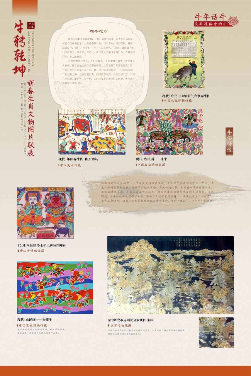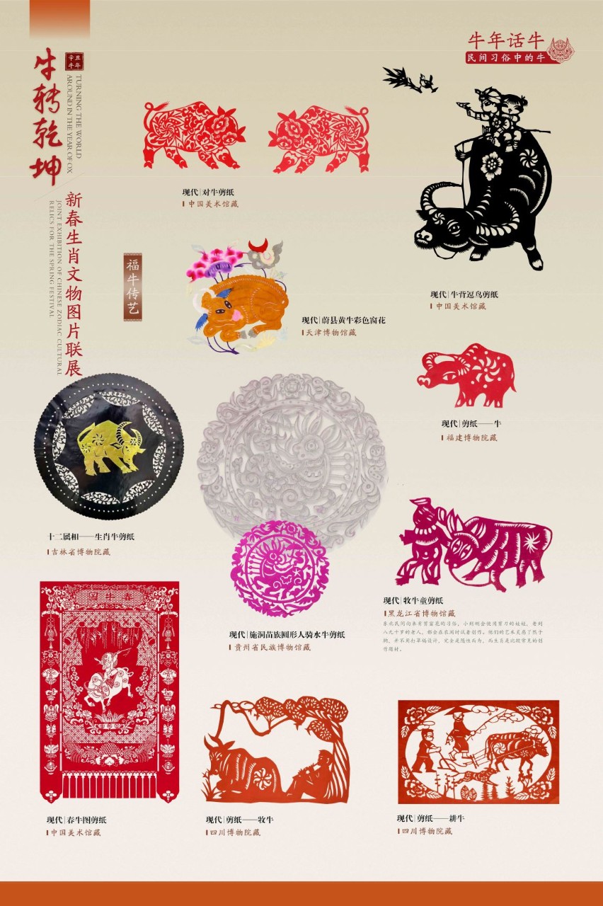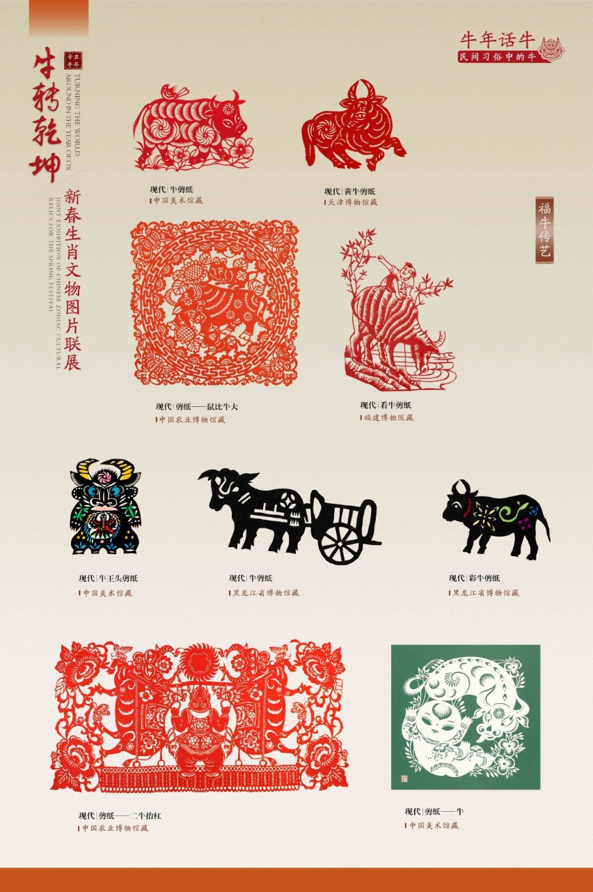 该展览从“生肖故事——生肖文化的源与流”“牛族本纪——自然世界中的牛”“五牛迎春——历史文化中的牛”“牛年话牛——民间习俗中的牛”等角度,众筹数百幅文物艺术品图片,于多地同步奉展给公众。期盼展览中耕地播种、载拉运送、雄壮威猛、憨态可掬的牛儿们,让您追忆起往昔岁月、乡土乡愁的那份美好,并在纳福迎祥的佳节喜庆中汲取勤奋务实、开拓进取的精神力量。