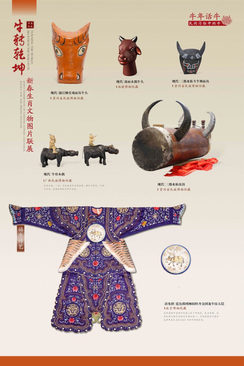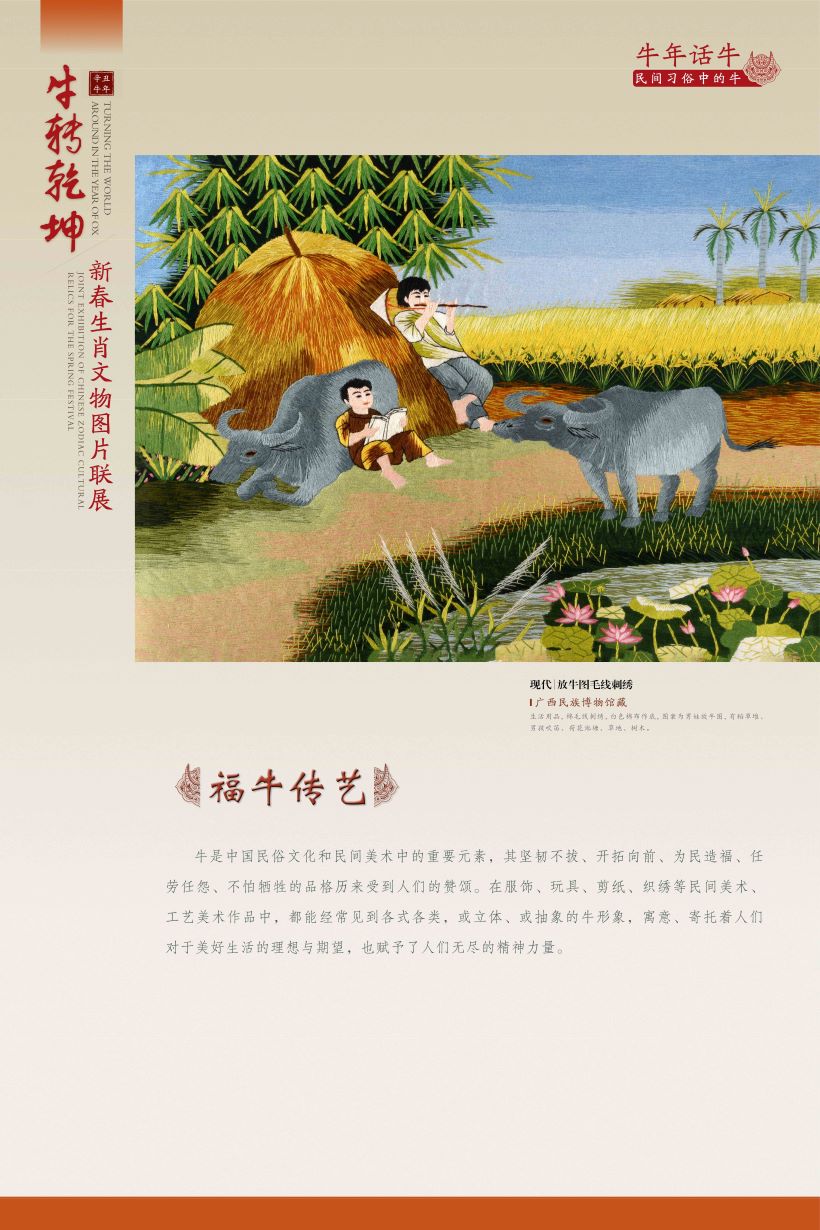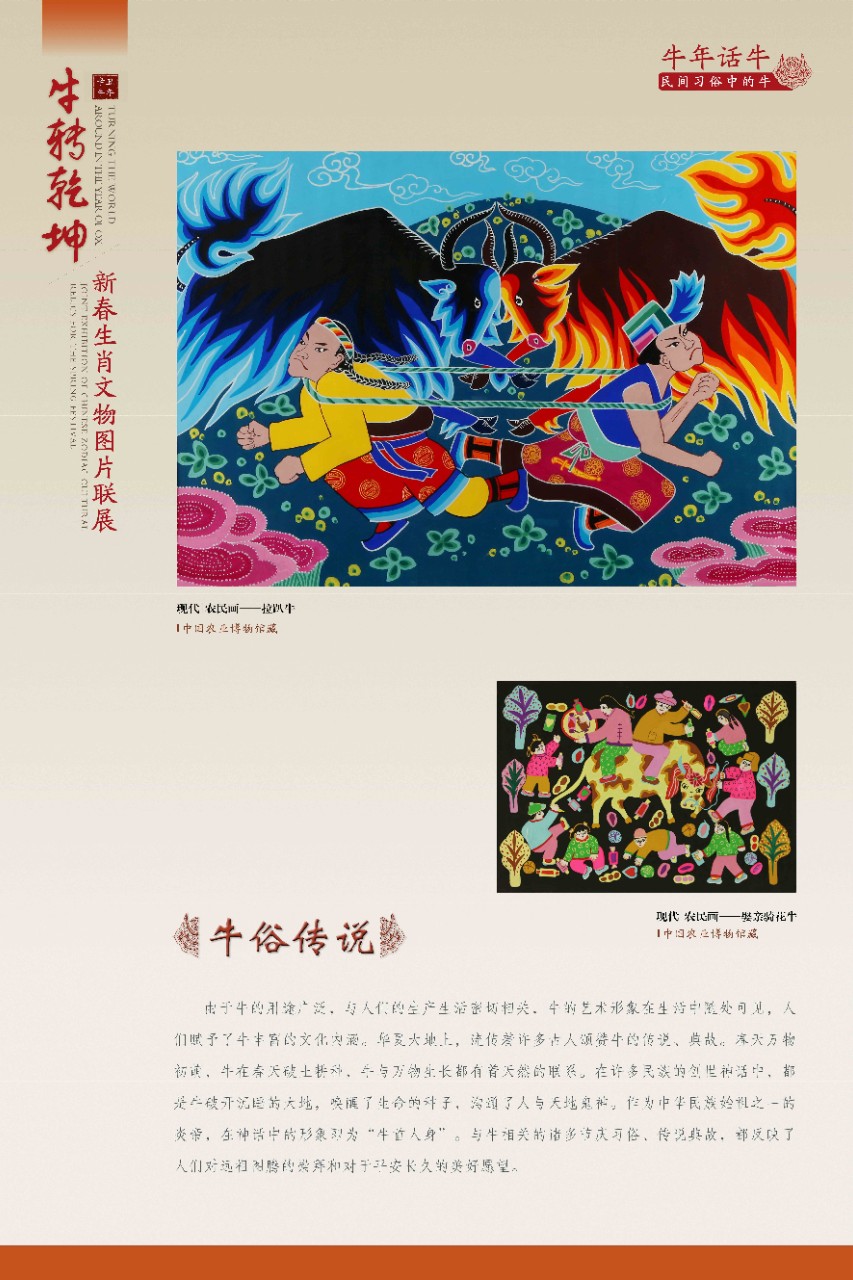 该展览从“生肖故事——生肖文化的源与流”“牛族本纪——自然世界中的牛”“五牛迎春——历史文化中的牛”“牛年话牛——民间习俗中的牛”等角度,众筹数百幅文物艺术品图片,于多地同步奉展给公众。期盼展览中耕地播种、载拉运送、雄壮威猛、憨态可掬的牛儿们,让您追忆起往昔岁月、乡土乡愁的那份美好,并在纳福迎祥的佳节喜庆中汲取勤奋务实、开拓进取的精神力量。