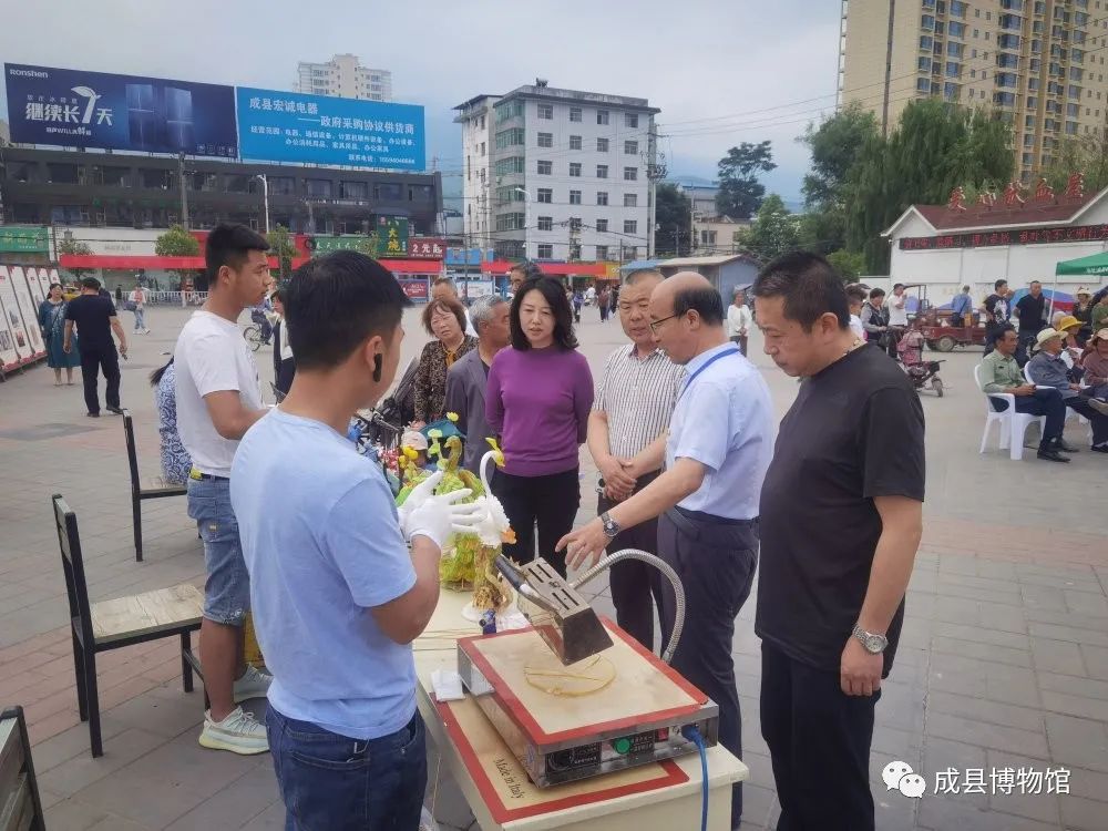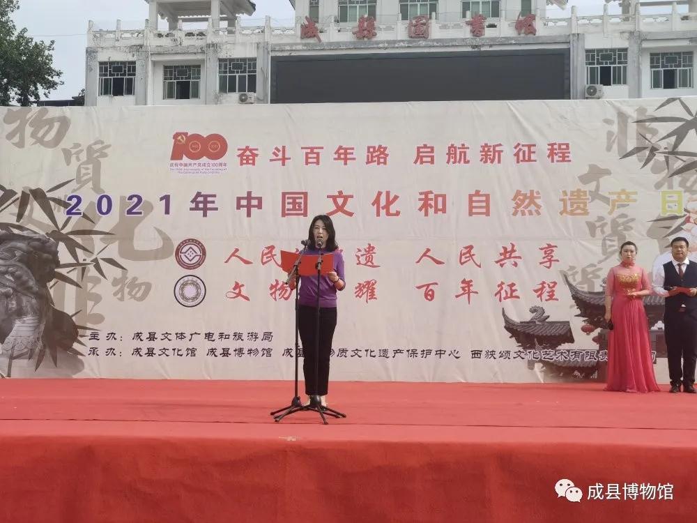 为热烈庆祝建党一百周年和第五个“文化和自然遗产日”,全面展示成县“文化遗产”保护成果,2021年6月10日,由成县文体广旅局主办,成县文化馆、成县博物馆、成县非遗中心、成县西狭文化艺术有限责任公司承办的2021年“文化和自然遗产日”宣传活动,在成县文化广场隆重举行。今年“文化和自然遗产日”活动围绕“文物映耀百年征程”、“人民的非遗 人民共享”这一主题开展了一系列丰富多彩的宣传展演活动。县人大常委会副主任任育新,政府副县长李丽出席活动。