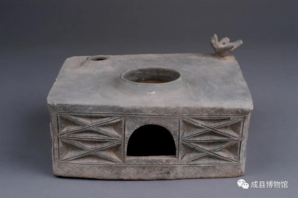 家禽灰陶灶 汉,长22.0厘米,宽18.5厘米,高8.5厘米。灶身长方形,灶门正上方有一火眼,上置釜,左上角有一小火眼,上置一小釜,两釜之间至左上角刻划一条网格纹带。拱形灶门,灶门正面上下边沿刻划网格纹,灶四周为连续“X”形浮雕装饰。右上角有一飞鸽形烟囱。